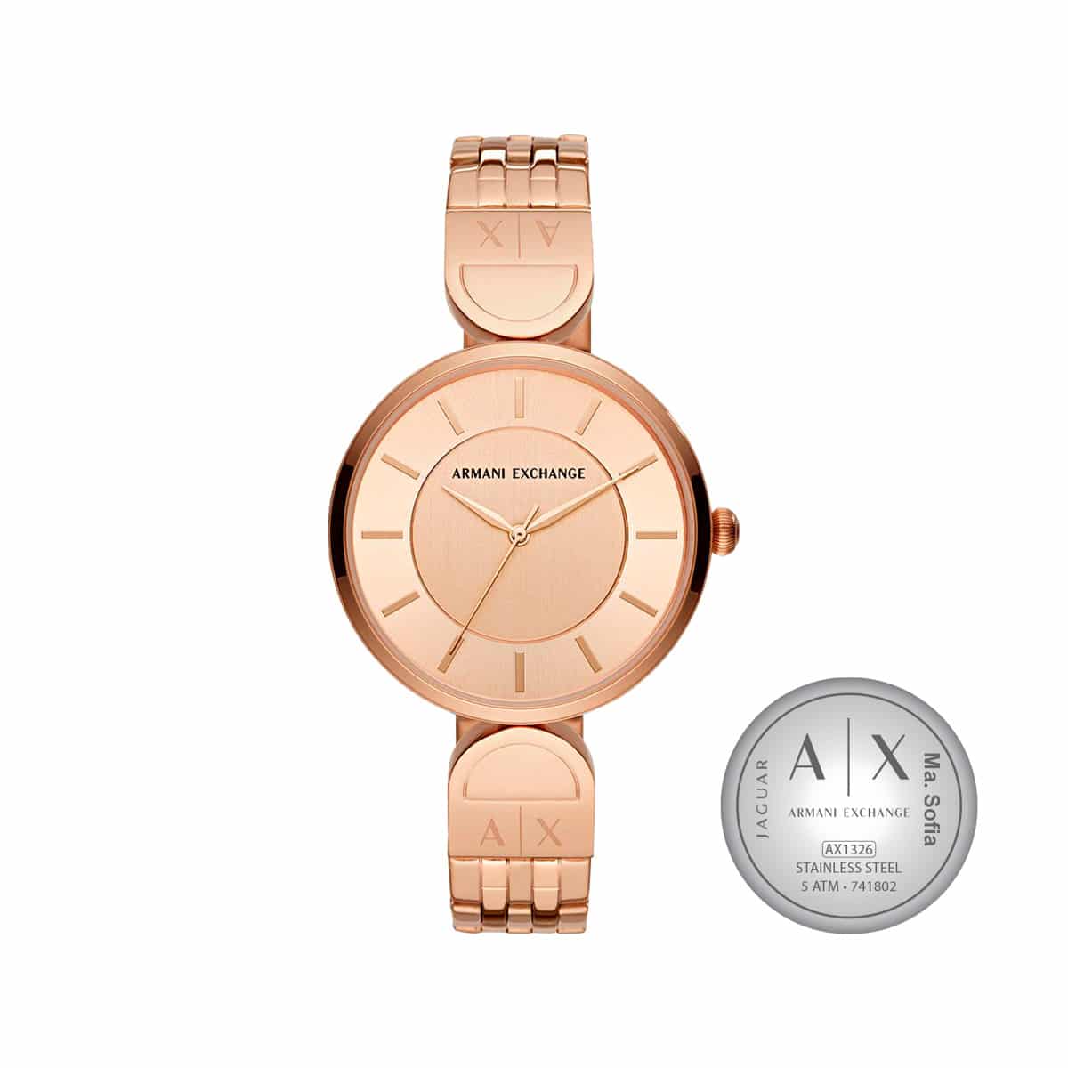 Reloj de dama de acero inoxidable oro rosado con extensible de acero oro rosado, mecanismo japonés y batería alcalina. Incluye estuche original Armani Exchange.
